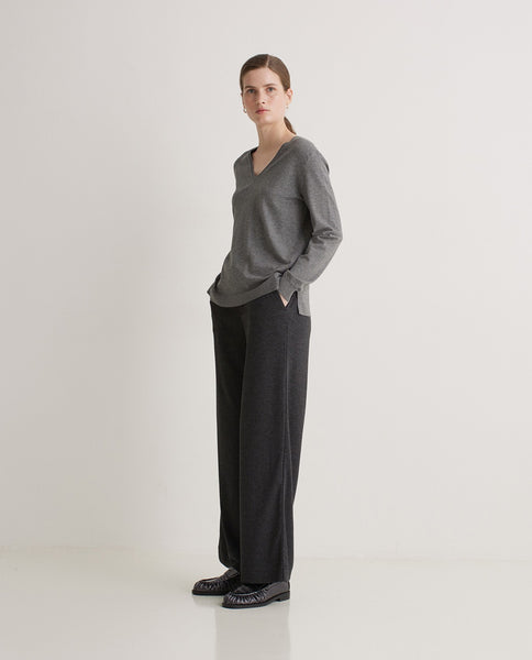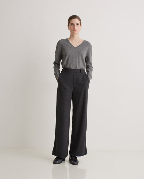 Gebreide broek. Wijde snit. Geen sluiting. Elastische tailleband. Riemlussen in de taille. Twee steekzakken.