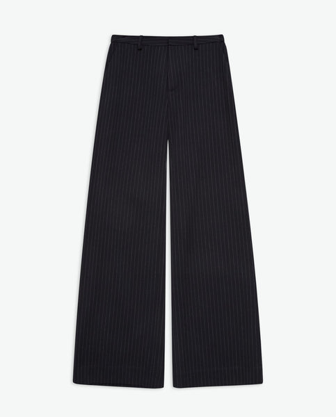 Wijde broek. Jacquardmix van viscose en gerecyclede vezels. Krijtstreepprint. Rits- en haaksluiting. Riemlussen. Elastische tailleband aan de achterkant. Twee steekzakken en twee paspelzakken achter.