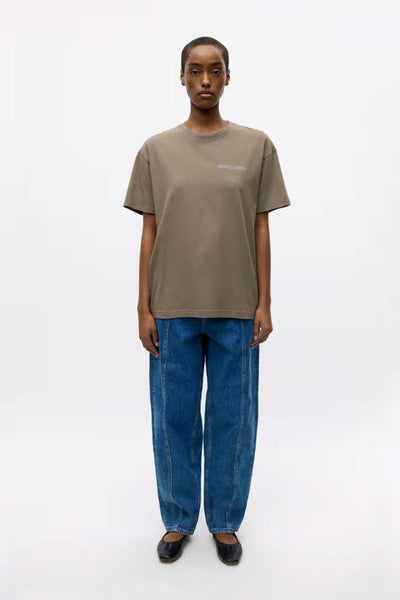 Tapered-leg blue jeans. Denim gemaakt van een mix van katoen en gerecycled katoen met versleten blauwe wassing en contrasterende stiksels. Verborgen rits- en knoopsluiting bij de tailleband. Twee zakken aan de voorkant. Merk zilveren knoop. Verticale naaddetails aan de voor- en achterkant. Middelhoge taille met taps toelopende pijp.