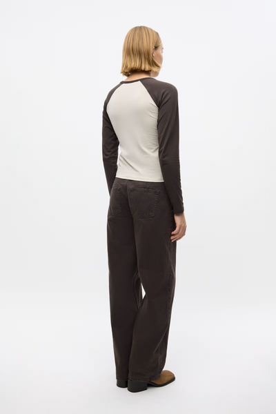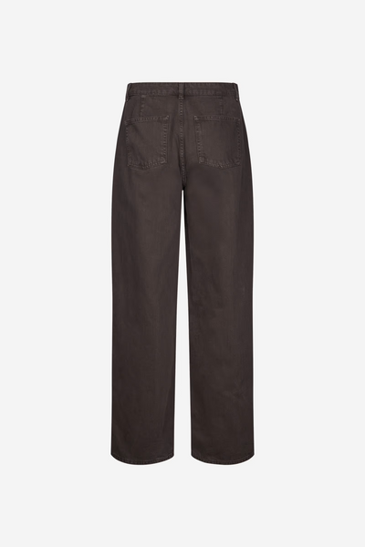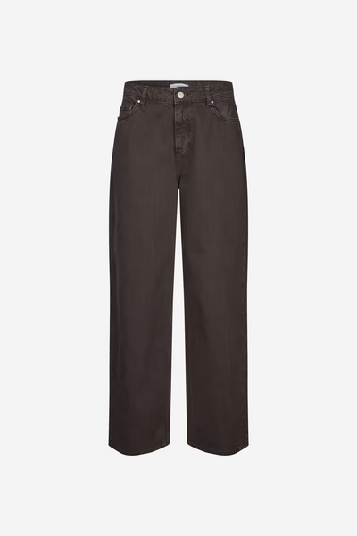 Jeans met een middelhoge taille. Denim van biologisch katoen met een used chocolate wash. Verborgen ritssluiting met knoop in de tailleband. Five-pocket-model. Middelhoge taille en losse pijpen.