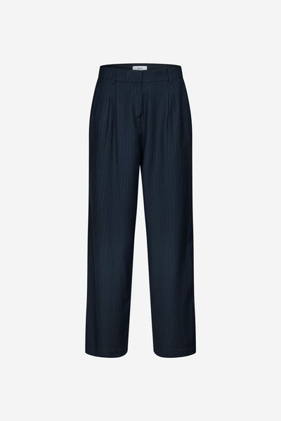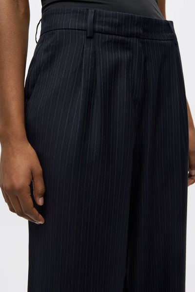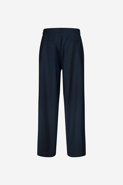 Broek met krijtstreep en lage taille. Zachte en soepele stof in kostuumkwaliteit met krijtstreepmotief. Verborgen rits-, haak- en knoopsluiting in de tailleband. Schuine zakken aan de voorkant en decoratieve zakken aan de achterkant. Plooien in de tailleband aan de voorkant. Lage taille en rechte, wijde pijpen.