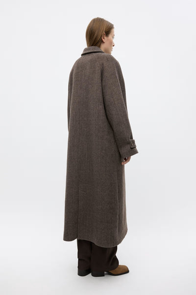 Lange jas met kraag. Zachte vezelmix met wol voor een licht geborstelde afwerking. Normale kraag en knoopsluiting met doorlopende knoopsluiting. Raglanmouwen met verstelbare bandjes aan de manchetten. Twee steekzakken. Split aan de achterkant. Volledig gevoerd. Normale pasvorm met recht silhouet.