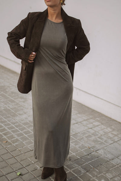 Lange, soepele strapless jurk. Gerimpelde schouderdetails. Ronde hals. Cupro-achtige stof. Lengte voor maat S: 128 cm.