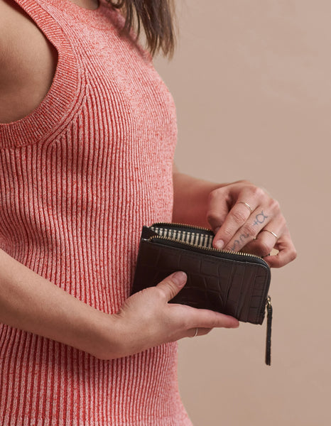 De Lola Coin Purse heeft voor het gemak vier kaartsleuven aan de buitenkant en een hoofdvak met ritssluiting. Ze is ook gevoerd met ons kenmerkende O My Bag gestreepte katoen. Iets groter dan een gewone portemonnee, er is genoeg ruimte voor een stoere lippenstift of je huissleutel! En hadden we al gezegd dat ze in onze iconische Nano Bag past ? - Het is een wedstrijd. De Croco-print wordt door hitte in het leer geperst, waardoor een patroon ontstaat dat uniek is voor elke individuele tas en nog meer unieke details toevoegt.