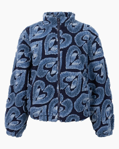 Onze Sara-jas is een terugkerende favoriet. Deze heeft een coole fleeceprint met een vervaagd hartje in denimlook. De kwaliteit is zacht fleece met een high-low designeffect. De jas heeft een ritssluiting en zakken. Het model heeft een losse pasvorm met elastische manchetten. Je kunt de onderkant strakker maken met de trekkoorden aan de binnenkant voor een luchtiger of korter model. De fleece-achtige structuur maakt de jas heerlijk comfortabel en houdt je warm op koudere dagen.