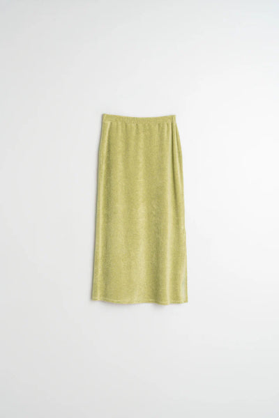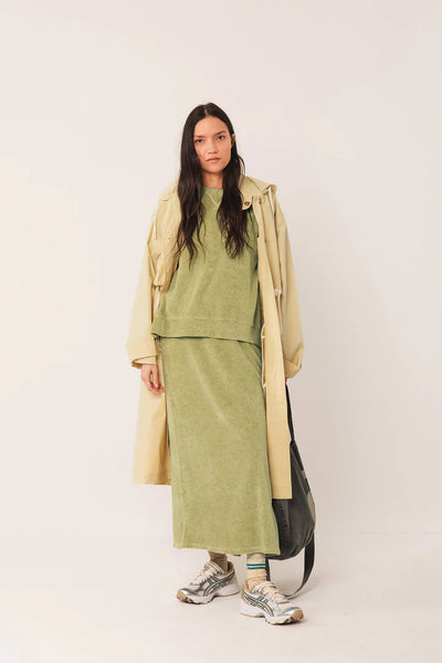 De ideale rok voor het tussenseizoen. Hij heeft een elastische tailleband, een licht getailleerde rechte snit en een zijsplit. De badstof maakt hem dé comfortabele rok van het seizoen.