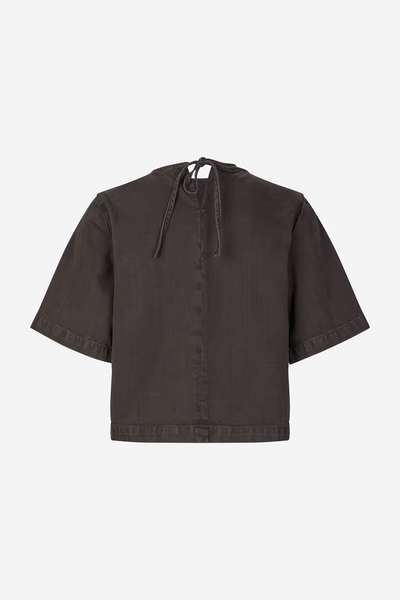 Top met ronde hals en strikbandjes. Dik biologisch katoen met ton-sur-ton stiksels. Ronde hals en striksluiting in de nek. Korte mouwen en buste-naden. Wijde, boxy pasvorm met recht silhouet.