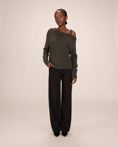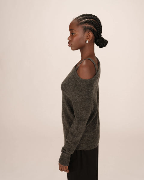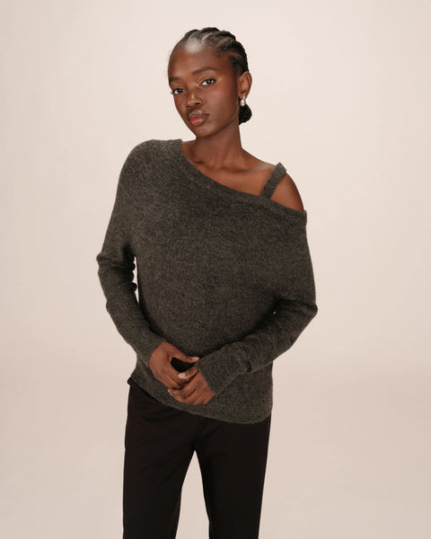- Eén bandje aan de blote schouderzijde zodat de trui op zijn plaats blijft