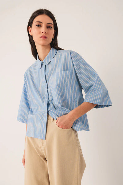 Een klassiek gestreept overhemd, maar dan in een cropped versie. Een vernieuwd kledingstuk met een vierkante snit, verlaagde schouders en losvallende korte mouwen. De katoenen poplin geeft het overhemd een trendy uitstraling.